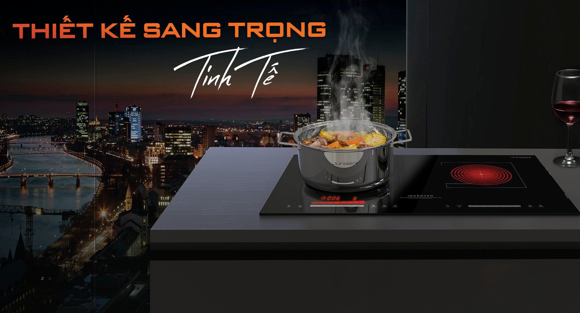 Dưới ánh đèn vàng ấm áp, bếp điện từ hồng ngoại Junger SIS-66 hiện lên như một tác phẩm nghệ thuật đỉnh cao với những công năng tuyệt vời kết tinh hoàn hảo giữa 2 dòng bếp từ và bếp hồng ngoại. Thiết kế mang đậm hơi thở của thời đại, toát lên vẻ đẳng cấp, thời thượng đậm chất Đức bao trùm khắp không gian.