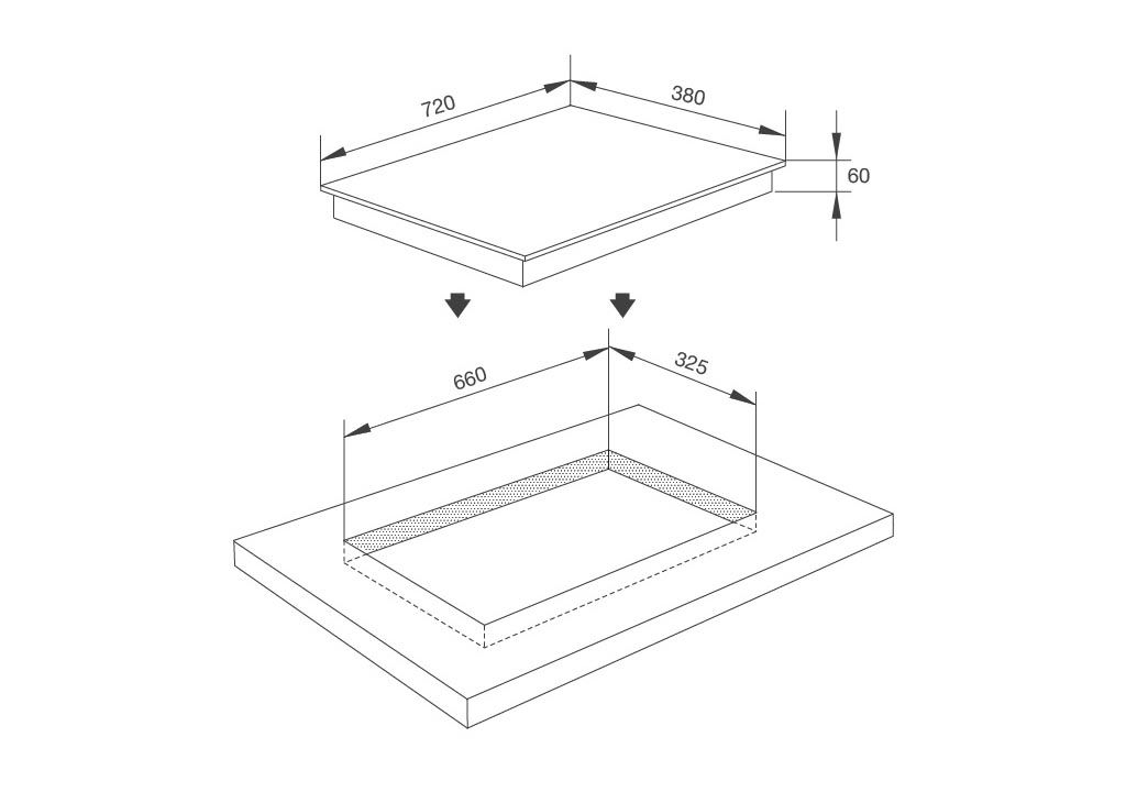 Kích thước bếp: Dài 720x Rộng 380x Cao 60mm