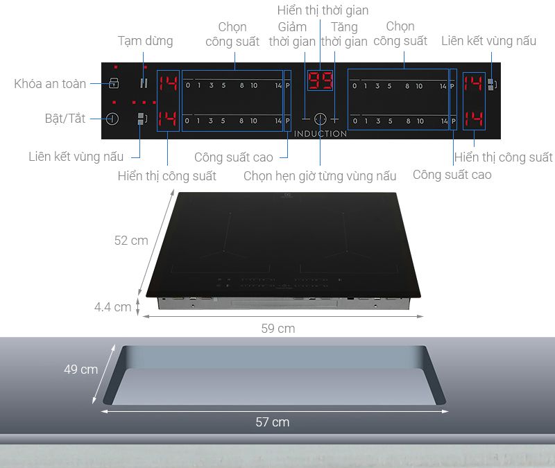 Chức năng hẹn giờ điều chỉnh linh hoạt và độc lập cho từng vùng nấu giúp bạn dễ dàng điều khiển trong quá trình nấu nướng. Thời gian hẹn giờ tối đa 60 phút cho phép kiểm soát chính xác thời gian nấu cần thiết. Sau khi hết thời gian hẹn giờ, bếp sẽ tự động tắt.