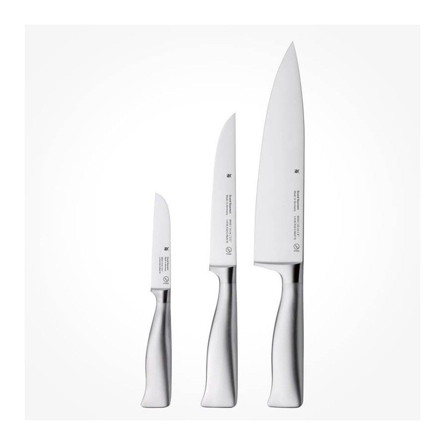 Bộ dao WMF Grand Gourmet 3 chiếc được đúc nguyên khối, gia công tại nhà máy WMF tại CHLB Đức. Dòng Grand Gourmet có thiết kế sang trọng và thanh lịch, chỉ duy nhất một màu thép sáng từ đầu lưỡi dao tới cuối cán dao. Bộ dao WMF Grand Gourmet 3 chiếc này được đúc nguyên khối. Mỗi chiếc dao có kích thước khác nhau phù hợp với nhiều công việc làm bếp.