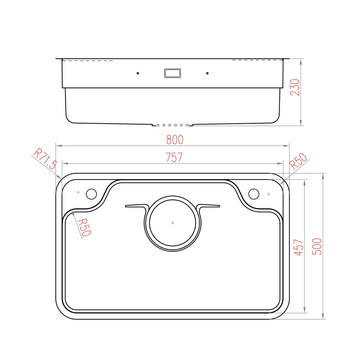 - Kích thước cắt đá: 757R x 457S mm, R50