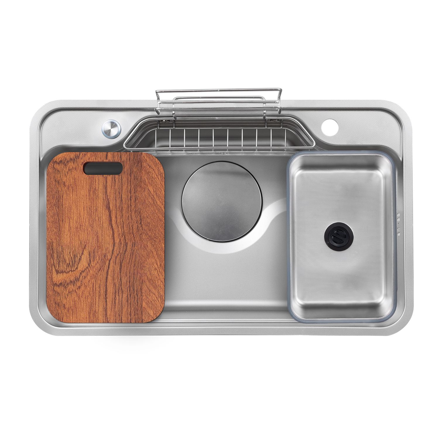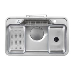 Bộ sản phẩm bao gồm: 01 chậu rửa + 01 bát rác + 01 Siphon + 01 giỏ inox + 01 thớt gỗ + 02 chậu inox nhỏ.