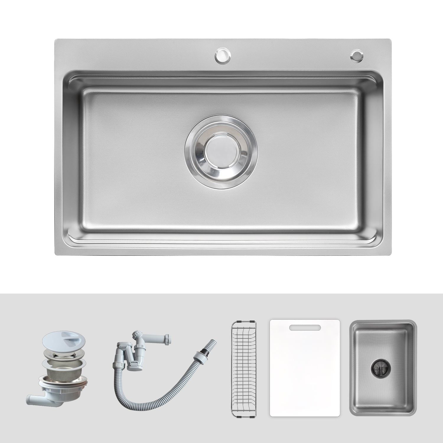 Bộ sản phẩm bao gồm: 01 chậu rửa + 01 bát rác + 01 Siphon + 01 giỏ inox + 01 chậu nhỏ + 01 thớt nhựa.
