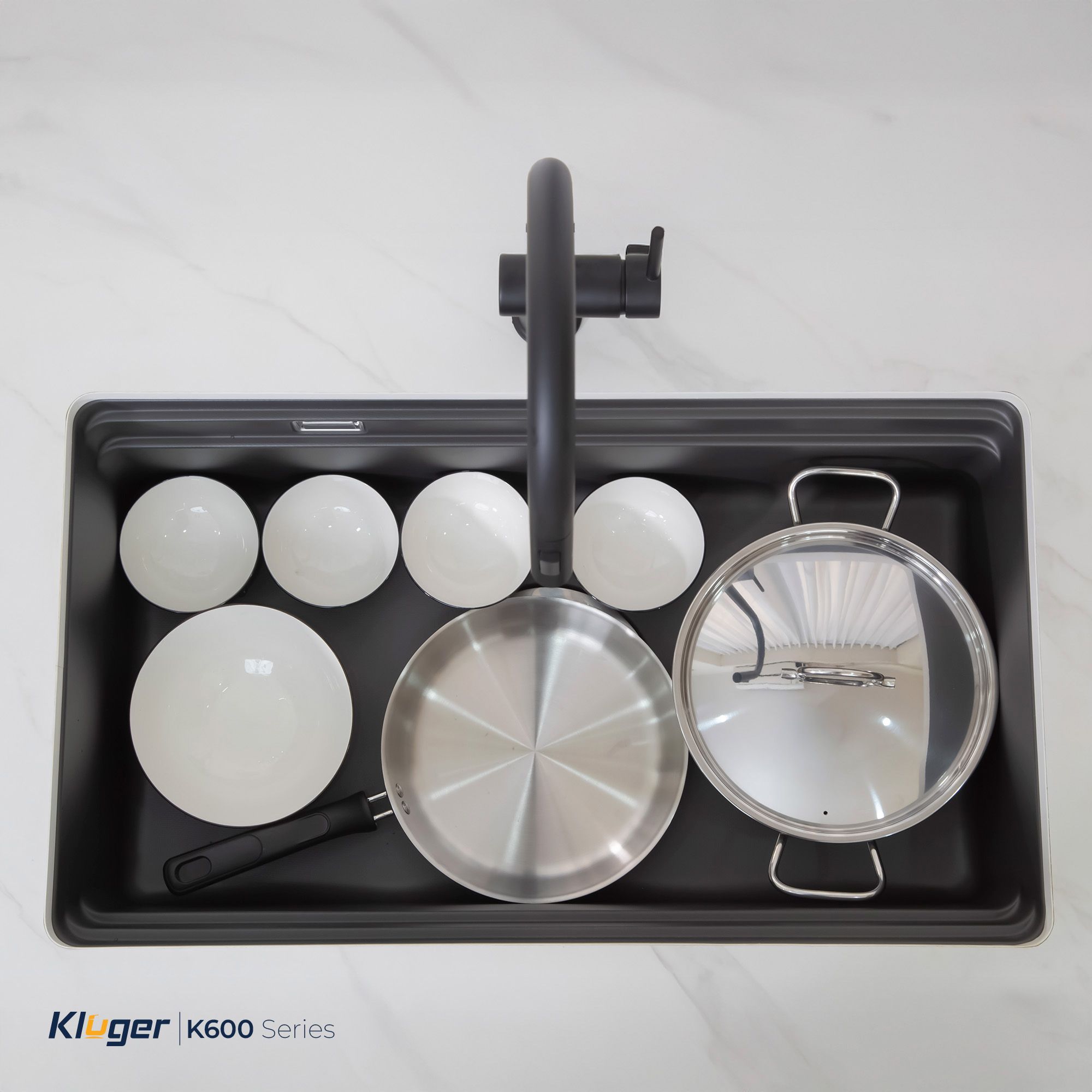 Chậu rửa bát Kluger KG7644FB Plus (phiên bản đầy đủ phụ kiện) thuộc bộ sưu tập K600 Series – “SANG TRỌNG TRÊN TỪNG ĐƯỜNG NÉT”. Không chỉ là một chiếc chậu bếp đơn thuần, K600 được thiết kế với triết lý nâng tầm trải nghiệm, tích hợp nhiều tính năng thông minh giúp công việc bếp núc trở nên tiện lợi, gọn gàng và hiệu quả hơn bao giờ hết.