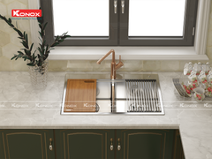 Chậu rửa bát Model KN8850TD được tối ưu công năng nhờ thiết kế hạ bậc, tích hợp phụ kiện đi kèm mang tới trải nghiệm tuyệt vời trong thao tác làm bếp.