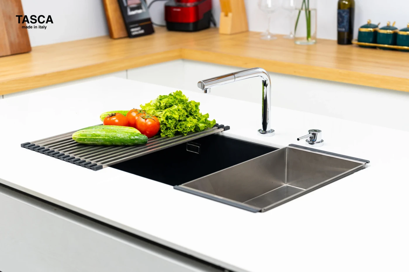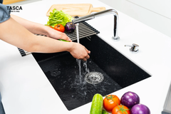 - Chậu tích hợp cùng nhiều phụ kiện: khay phụ, rây lưới,... giúp việc vào bếp được dễ dàng hơn.