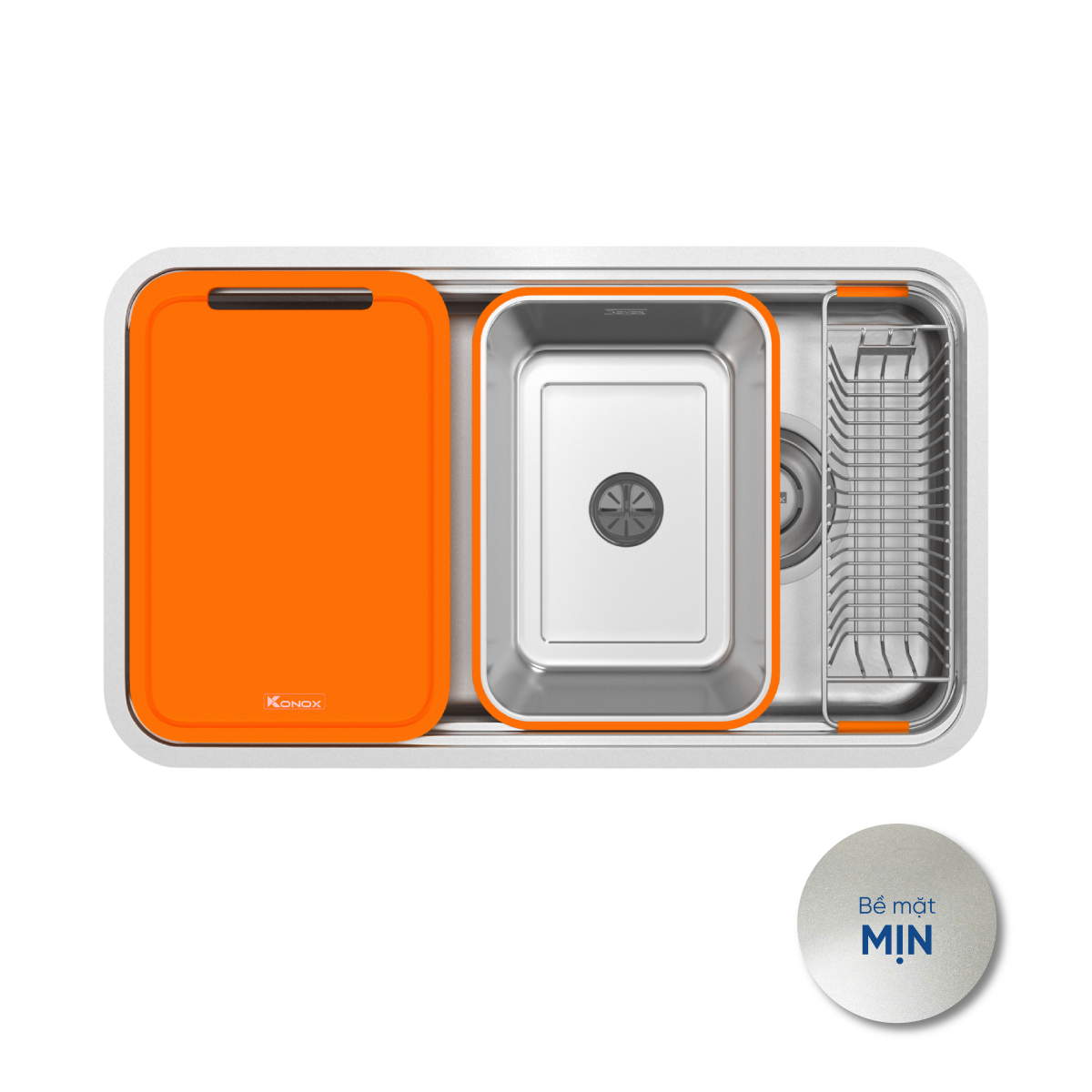 - Tích hợp phụ kiện đáp ứng đủ tiêu chí sử dụng hàng ngày của người nội trợ: thớt nhựa cam, colander và rổ phụ.