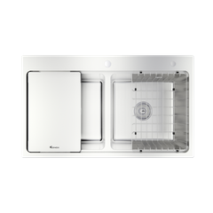 - Thiết kế hiện đại với gờ hạ bậc – tích hợp phụ kiện thông minh: Siphon, giá úp bát inox, thớt inox.
