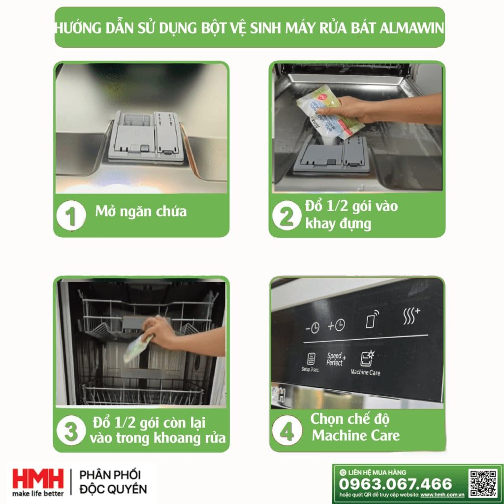 + MRB: Dùng 1 gói vệ sinh. Đổ đầy ngăn chứa chất vệ sinh trên máy, phần còn lại đổ đầy khoang Máy Rửa Bát. Chọn chương trình vệ sinh máy hoặc chương trình có nhiệt độ cao nhất