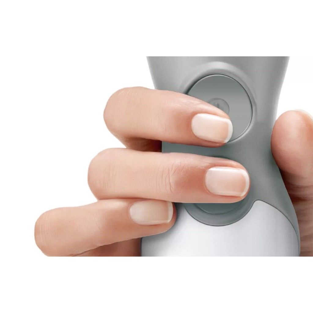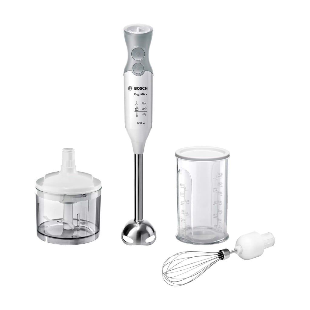 - Máy xay sinh tố Bosch màu trắng xám trang nhã, kiểu cầm tay gọn gàng, dễ dàng sử dụng và cất giữ, phù hợp cho các gia đình có trẻ nhỏ.