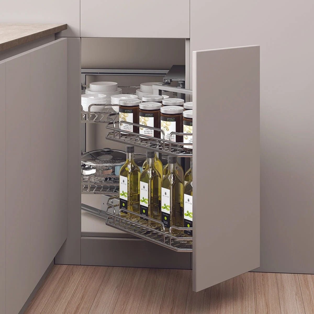 + Phiên bản của giá góc liên hoàn Hafele 548.21.022 mở phải cho tủ 900mm giảm chấn