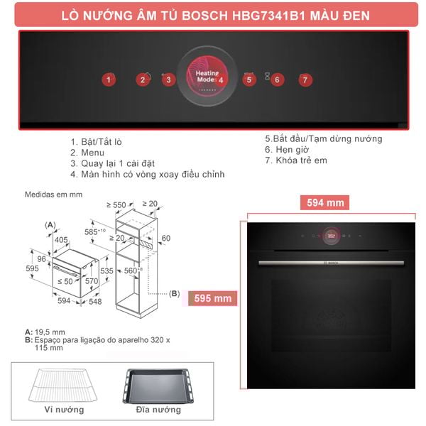 Thông số kỹ thuật chi tiết LÒ NƯỚNG ÂM TỦ BOSCH HBG7341B1 LÀM SẠCH THỦY PHÂN MÀU ĐEN