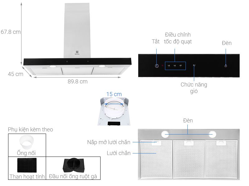 Thông số kỹ thuật chi tiết MÁY HÚT MÙI ÁP TƯỜNG ELECTROLUX LFT769X DẠNG ỐNG 90CM