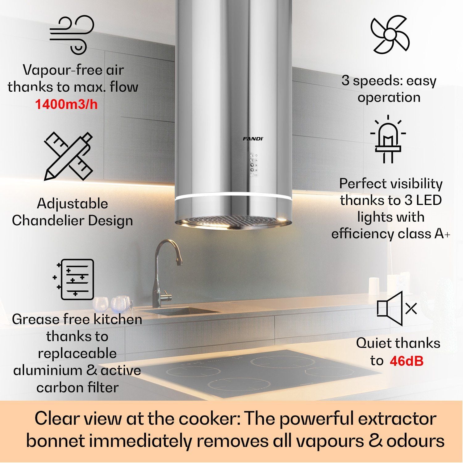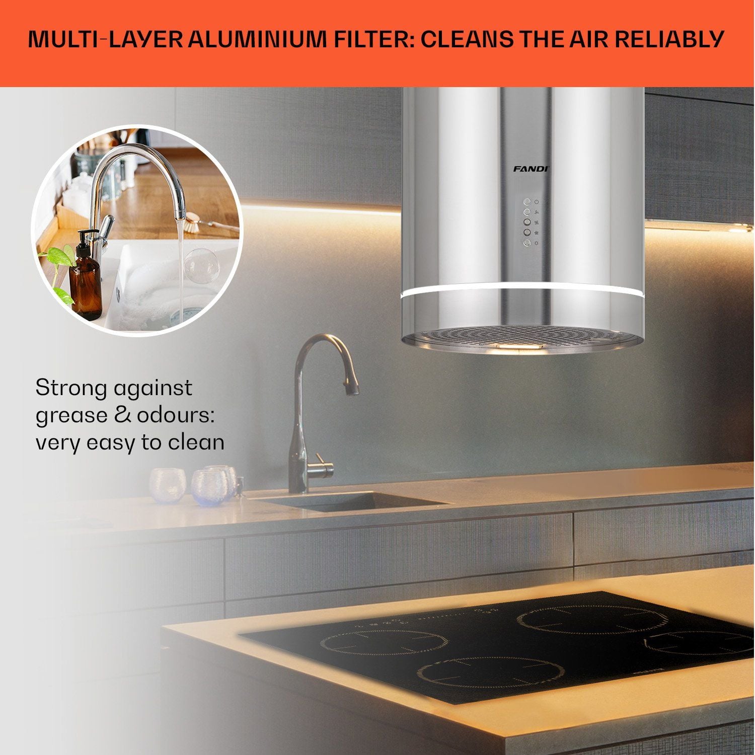 Được thiết kế đối lưu ngăn cản hơi nước, hơi dầu mỡ ngưng tụ và đọng vào động cơ máy. Lưới lọc là sự kết hợp giữa inox 304 và Aluminum không gỉ, chống oxy hóa tốt giúp sản phẩm luôn sáng bóng, bất chấp sự ăn mòn của môi trường bếp. Ngoài ra, máy hút mùi Fandi FD-8899ID SMART còn được tăng cường khả năng khử mùi với Than Hoạt Tính.Chiếu sáng êm dịu - Decor Lighting Led kêt hợp Led Energy Saving