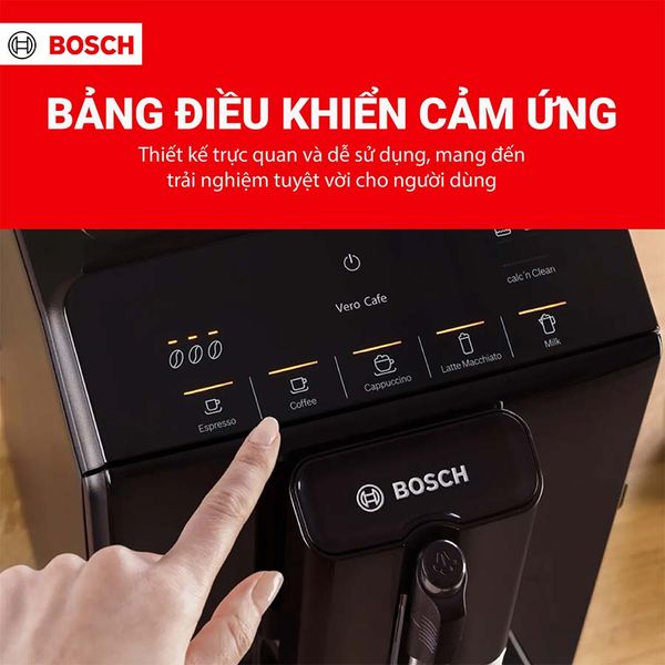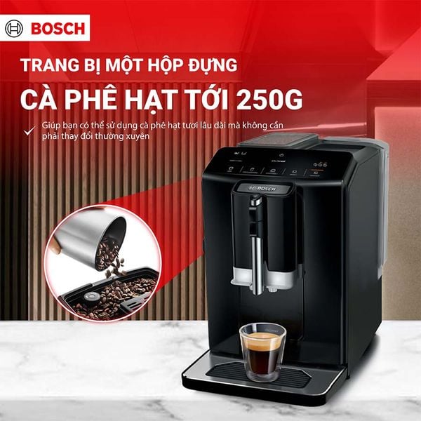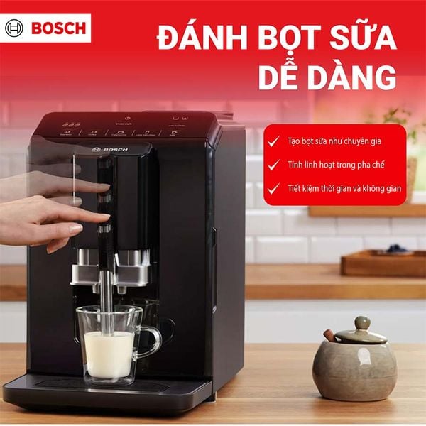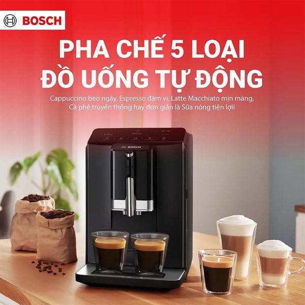 Máy pha cà phê Bosch TIE20119 là lựa chọn lý tưởng cho những ai yêu thích cà phê chuẩn quán ngay tại nhà. Với thiết kế sang trọng, điều khiển cảm ứng hiện đại, 5 loại cà phê tự động cùng hệ thống tạo bọt sữa mịn màng, máy đáp ứng trọn vẹn nhu cầu thưởng thức cà phê hằng ngày. Không chỉ vậy, tính năng vệ sinh tự động và dung tích chứa tiện lợi khiến Bosch TIE20119 trở thành một trong những model đáng sở hữu trong phân khúc máy pha cà phê gia đình.