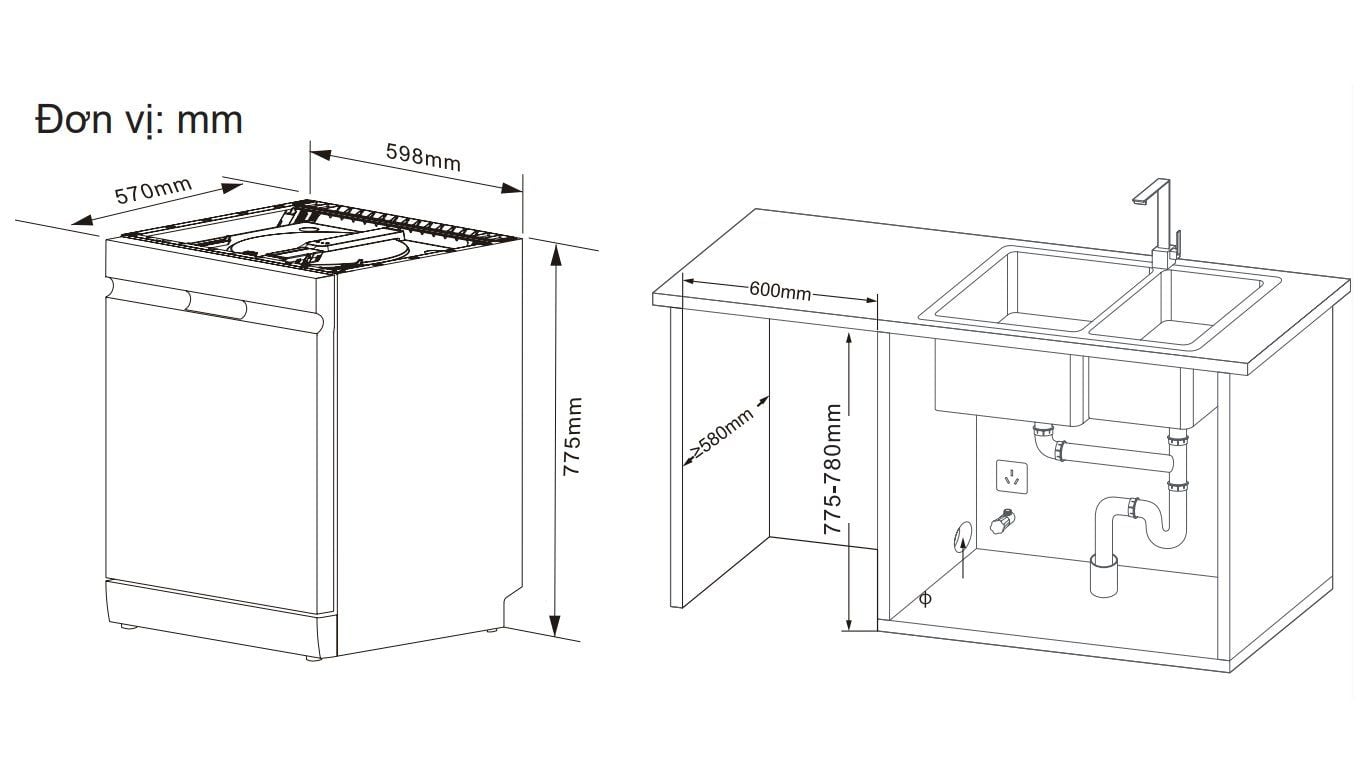 Kích thước lắp âm tủ: R605 x S(570-588) x C(780-810) (mm)