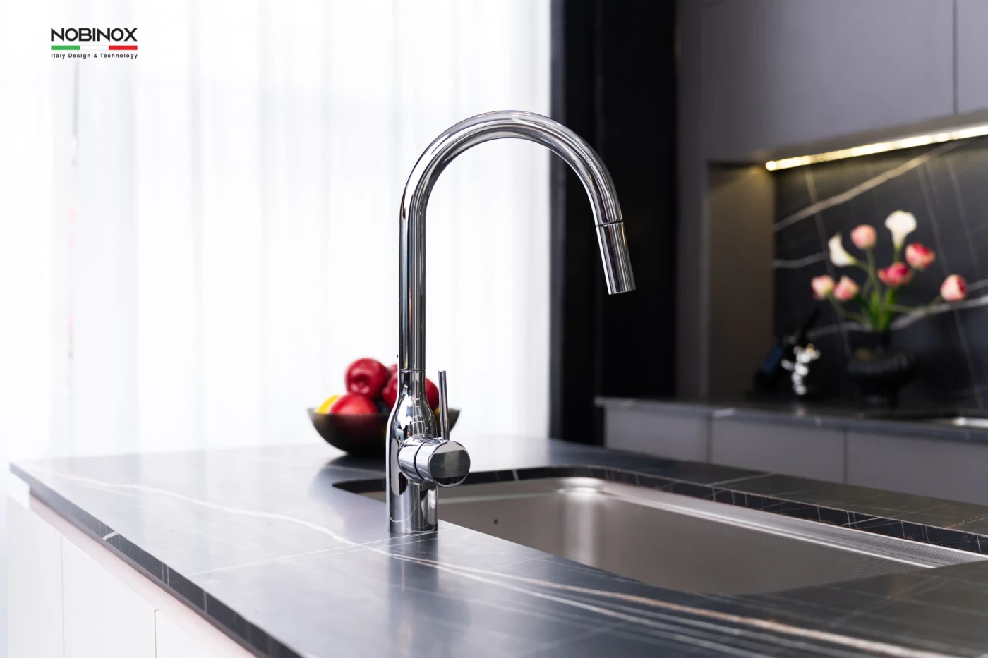 NOBINOX AQUA NX660N được hoàn thiện từ inox 304 bền bỉ, chống gỉ sét hiệu quả. Bề mặt sáng bóng dễ vệ sinh, kết hợp đầu vòi 2 chế độ xả linh hoạt và chiều cao 420mm, mang lại trải nghiệm sử dụng tiện lợi trong không gian bếp hiện đại.
