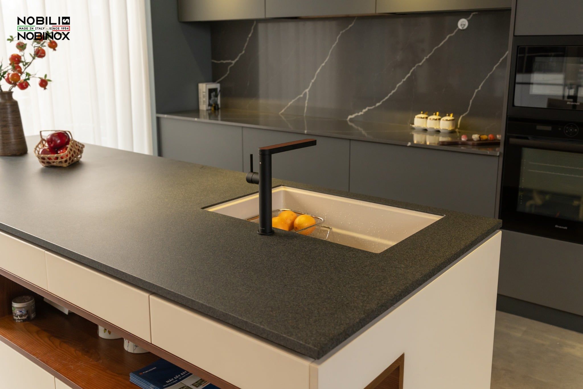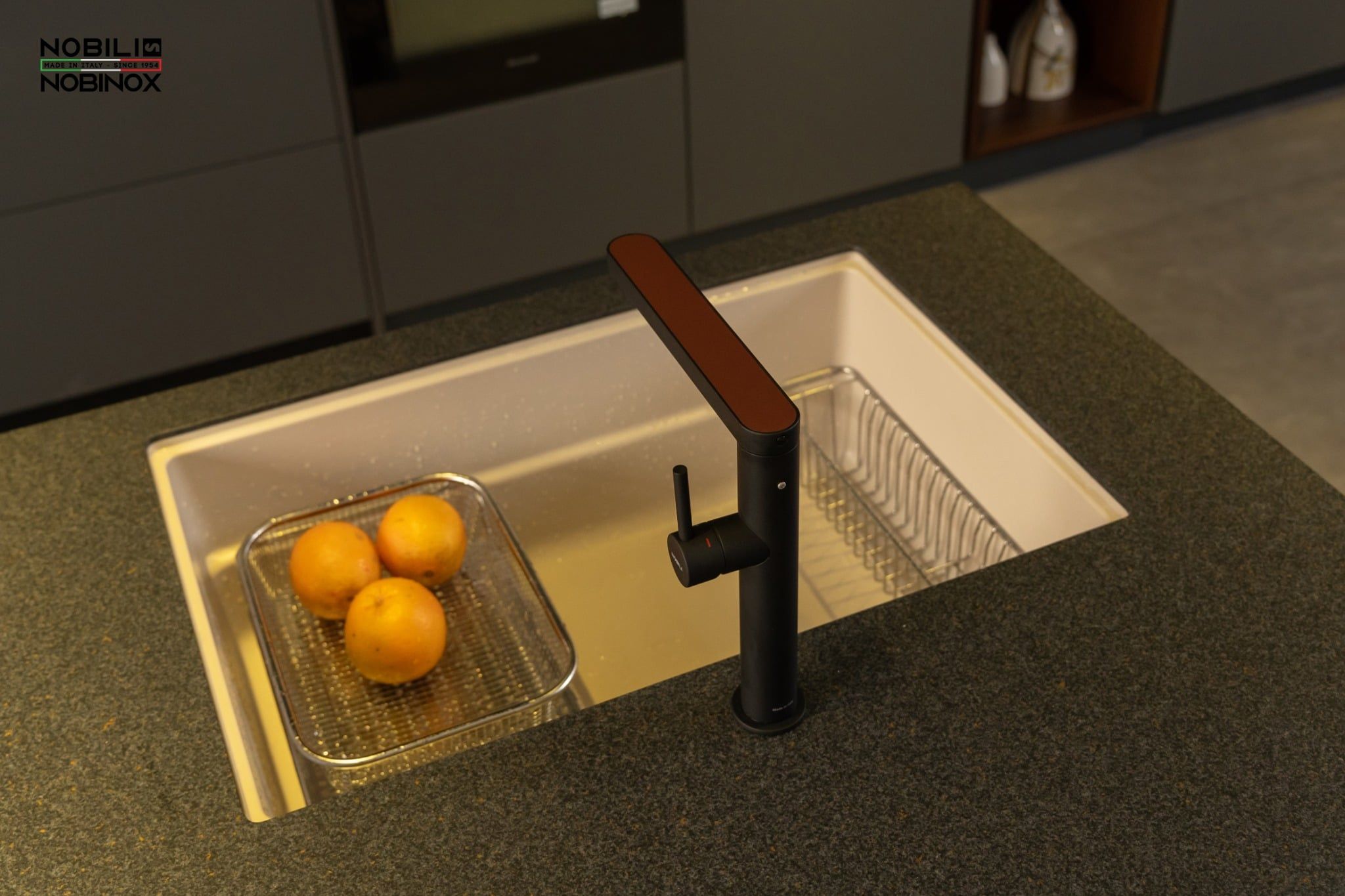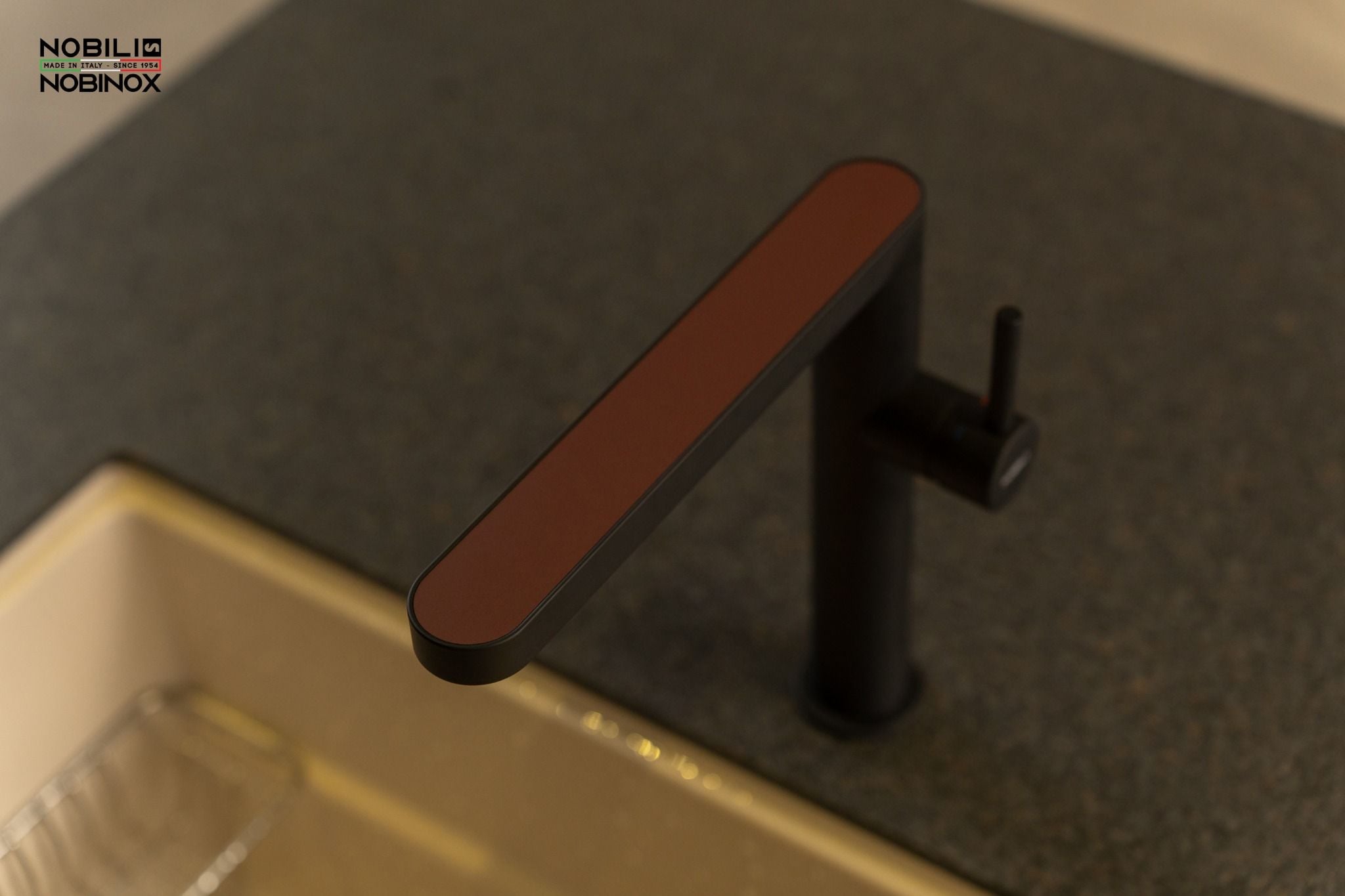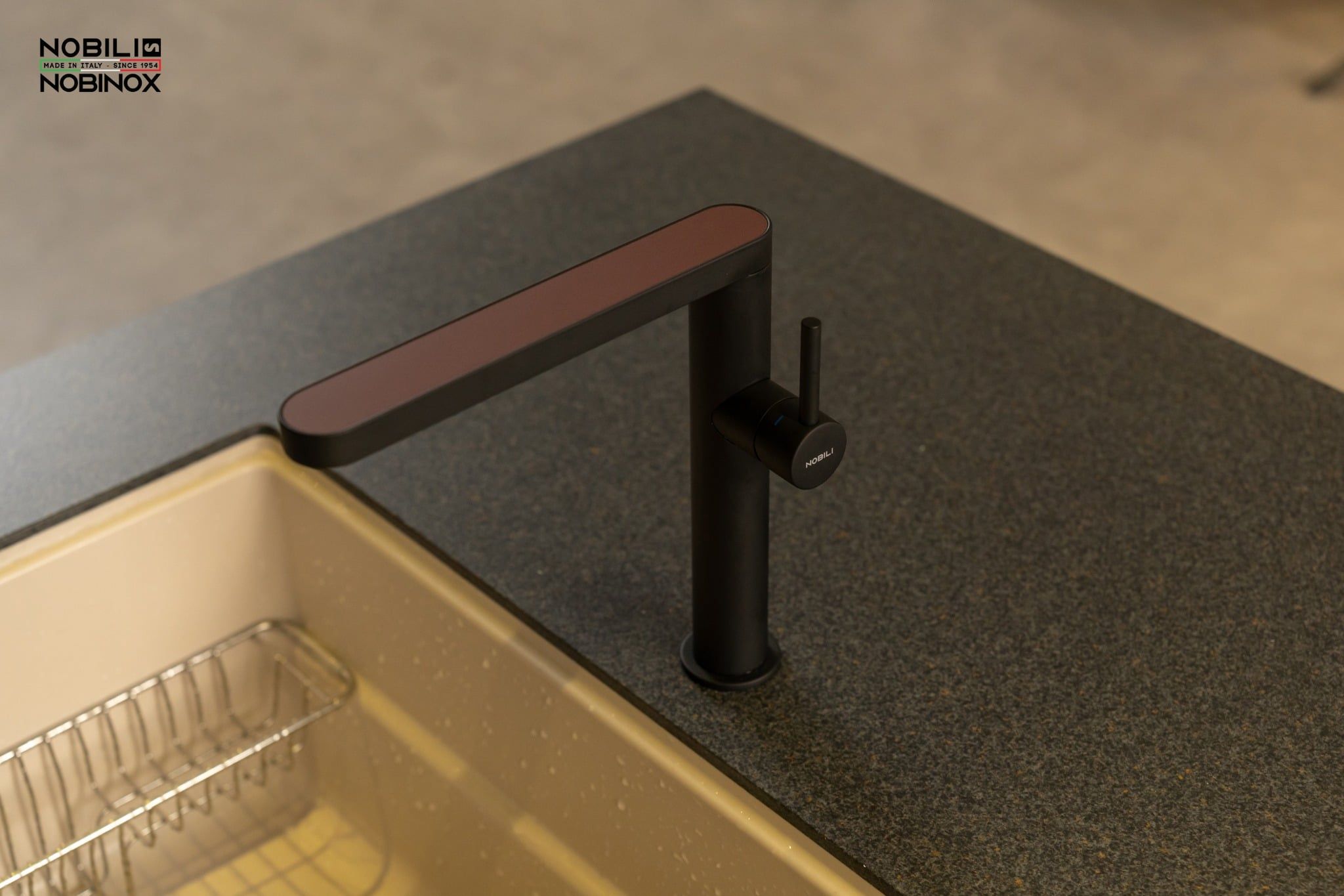 - Thiết kế với lớp hoàn thiện Mora Matt tạo sự sang trọng cho không gian bếp, vòi bếp sản xuất tại trung tâm Công nghệ Nobili theo tiêu chuẩn môi trường nghiêm ngặt.