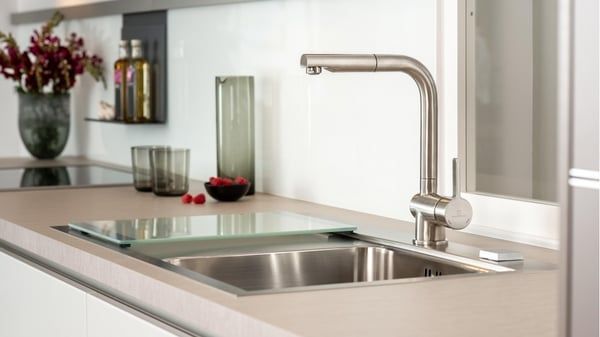 - Thiết kế hiện đại, sang trọng: Với lớp hoàn thiện mạ niken xước (Brushed Nickel), sản phẩm mang lại vẻ ngoài tinh tế, phù hợp với nhiều không gian bếp cao cấp.